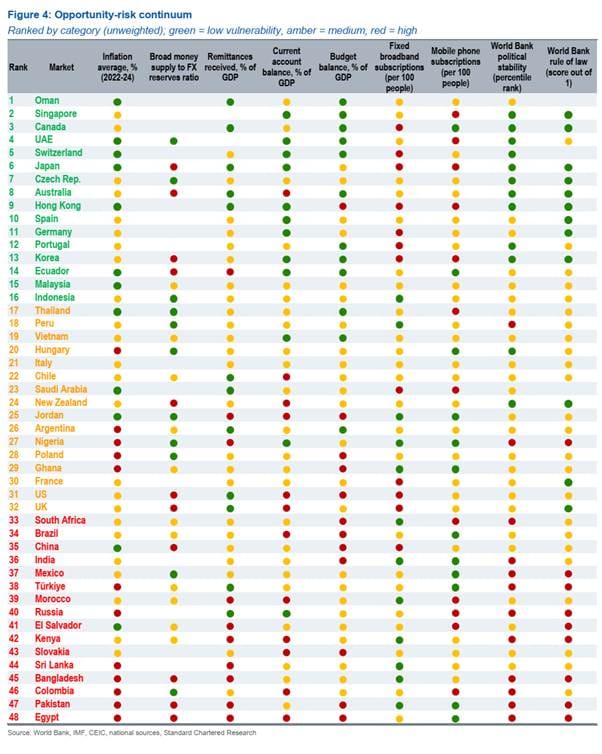 To determine which countries are most exposed, they build an “opportunity‑risk continuum” using nine indicators: inward remittances, inflation, current account and fiscal balances, money-to-FX reserves ratio, broadband and mobile penetration, and two governance measures (political stability and rule of law). They rank 48 markets on each metric, average the rankings, and then group them into low, medium and high vulnerability buckets. On this basis, Egypt, Pakistan, Bangladesh and Sri Lanka stand out as especially at risk of deposit flight into stablecoins, with others like Türkiye, India, China, Brazil, South Africa and Kenya also in the red zone, often characterised by twin deficits or recent balance‑of‑payments stress. At the safer end, countries like Oman, Singapore, Canada, the UAE, and Japan appear relatively insulated, thanks to stronger macroeconomic fundamentals and institutional frameworks.